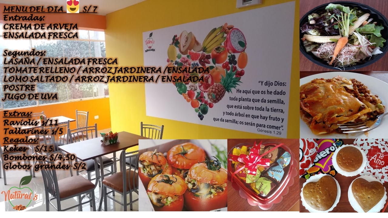Restaurante VeganoVegetariano Menus variados sopas y cremas de verduras Hamburguesas kekes tortas yogurt leche de soya pan integral granola ensalada de frutas